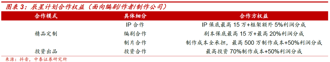 合作模式升级:抖音将与合作方进行定制、投资、版权保底合作,最高投入500万,可共享最高50%平台利润分成;