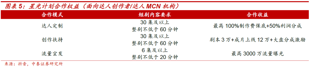 合作链路升级:抖音将提供优质IP/剧本保底合作,撮合头部演员和达人,投入最高100%制作费和亿级宣发资源曝光扶持。