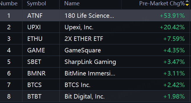 Ether-holding company shares shined in premarket; ATNF up 54%; UPXI up 20%; GAME up 4%.