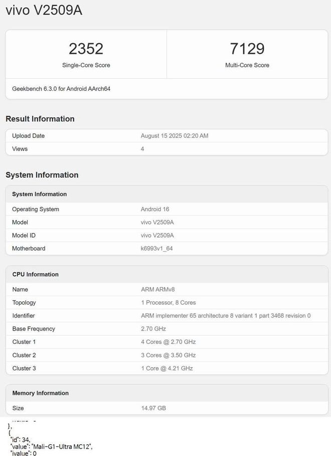 昨日,GeekBench 公布了 vivo V2509A 的机型跑分信息: