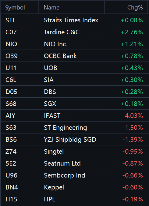 The Straits Times Index (STI), a key benchmark for the Singapore Exchange, ranged between 4,204.41 and 4,232.10 throughout the day. It ended the session at 4,219.54, up 3.35 points or 0.08% compared to Tuesday's close.