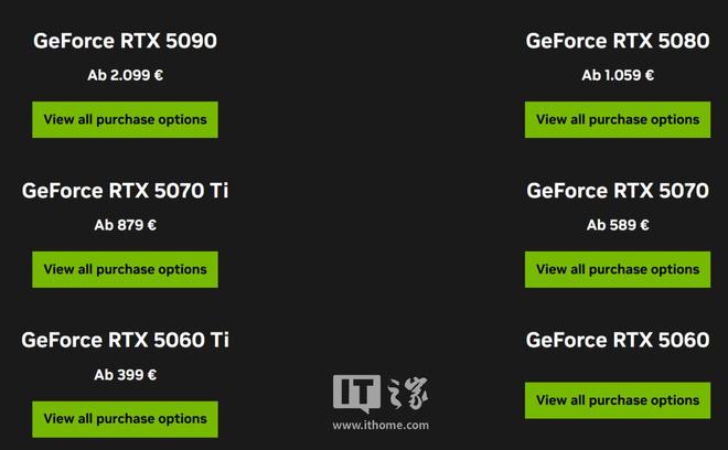 型号发布时价格当前价格降价比例RTX 50902329 欧元(IT之家注:现汇率约合 19535 元人民币)2099 欧元(现汇率约合 17606 元人民币)9.9%RTX 50801169 欧元(现汇率约合 9805 元人民币)1059 欧元(现汇率约合 8883 元人民币)9.4%RTX 5070 Ti879 欧元(现汇率约合 7373 元人民币)879 欧元(现汇率约合 7373 元人民币)无变化RTX 5070649 欧元(现汇率约合 5444 元人民币)589 欧元(现汇率约合 4940 元人民币)9.2%RTX 5060 Ti399 欧元(现汇率约合 3347 元人民币)399 欧元(现汇率约合 3347 元人民币)无变化RTX 5060319 欧元(现汇率约合 2676 元人民币)319 欧元(现汇率约合 2676 元人民币)无变化