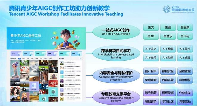 本次大会上,腾讯青少年AIGC创作工坊全新发布,作为面向中小学生的一站式人工智能AIGC学习与实践平台,它基于“腾讯混元+开源模型”的多模能力,覆盖“生文、生图、生视频、生3D、生音乐、生代码”六大功能,可以作为中小学AI+跨学科项目式学习平台工具,同时也为师生提供课程资源共享、学习社区、智能评价等教育支撑能力。AIGC创作工坊,将为学科教育、素养教育、创客教育、数字教育提供丰富的功能支撑,同时也将不断拓展创新教学场景,覆盖助学、助教、助研、助管、助评等中小学教育全场景。