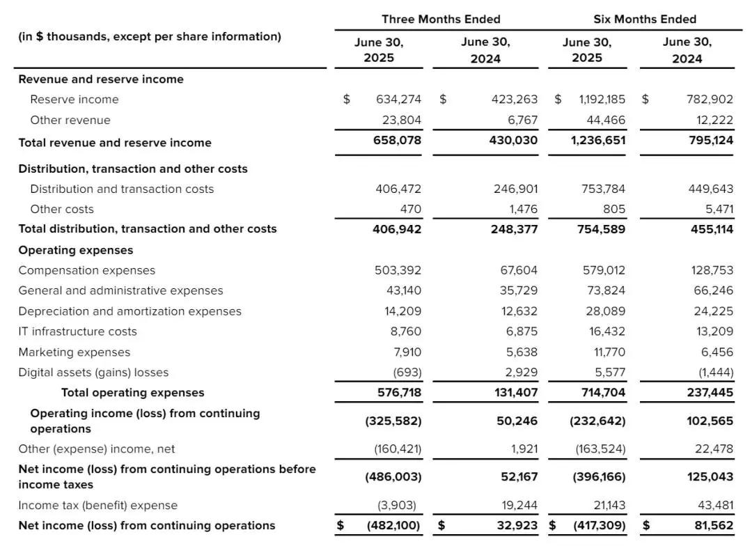 Circle在2025年第二季度持续经营净利润为-4.82亿美元,上年同期为3292万美元。Circle亏损主要受庞大的IPO费用影响。这些费用总计5.91亿美元:其中,4.24亿美元用于与 IPO 满足的归属条件相关的股票薪酬。由于股价上涨,Circle的可转换债券的公允价值增加1.67亿美元。