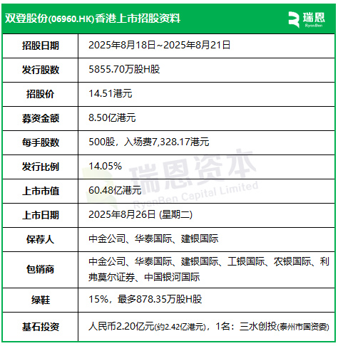 来自江苏泰州的双登股份(06960.HK),于今日(8月18日)起至周四(8月21日)招股,预计2025年8月26日在港交所挂牌上市,中金公司、华泰国际、建银国际联席保荐。