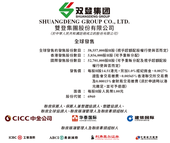双登股份,计划全球发售5855.70万股H股(占发行完成后总股份的14.05%),其中90%为国际发售、10%为公开发售,另有15%超额配股权。每股发售价14.51港元,每手500股,入场费7328.17港元,最多募资约8.50亿港元。
