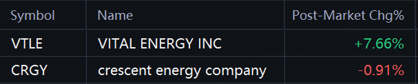 Vital Energy's shares rose 7.7% to $17 per share in extended trading after the Reuters report. Crescent Energy fell about 1% to $9.85 per share.