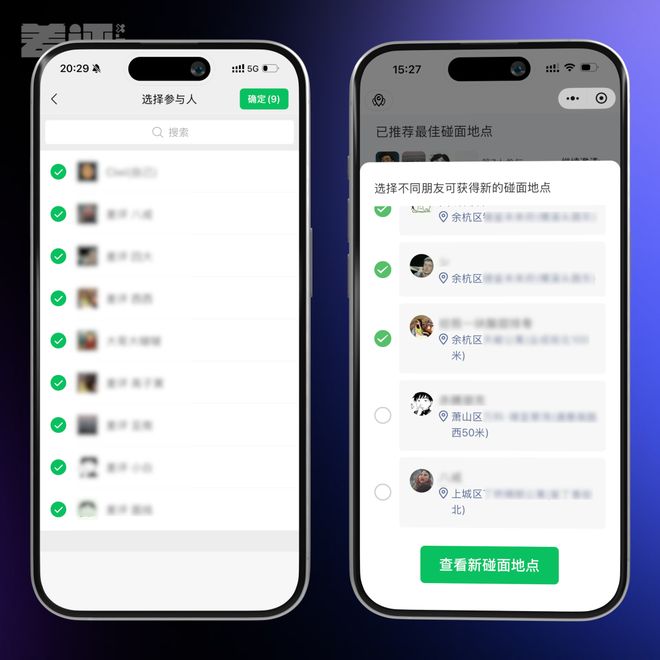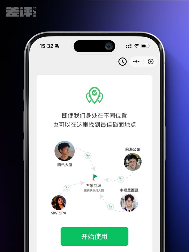 进入小程序后,给个定位权限,然后发起碰面,转发到群聊,让朋友们也定位一下。