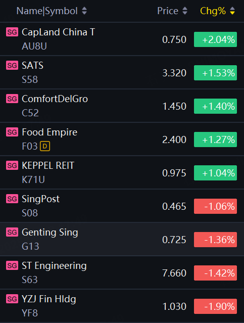 CapLand China T up 2%; Sats, ComfortDelGro, Food Empire, Keppel Reit up 1%; ST Engineering, Genting Sing, SingPost down 1%.