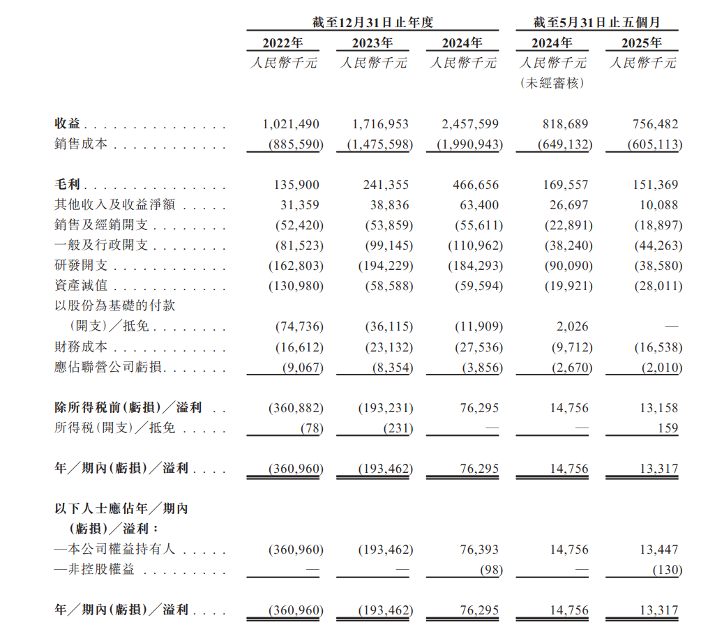 财务方面,于2022年度、2023年度、2024年度、2024年及2025年截至5月31日止五个月,飞骧科技实现收益分别约为10.21亿元、17.17亿元、24.58亿元、8.19亿元、7.56亿元人民币;同期,年/期内溢利分别约为-3.61亿元、-1.93亿元、7629.5万元、1475.6万元、1331.7万元人民币。