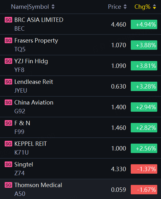 Thomson Medical Group was the biggest laggard, declining 1.7%, followed by shares of Singapore Telecom, which declined 1.4%. Shares of IFAST slipped 0.6%.