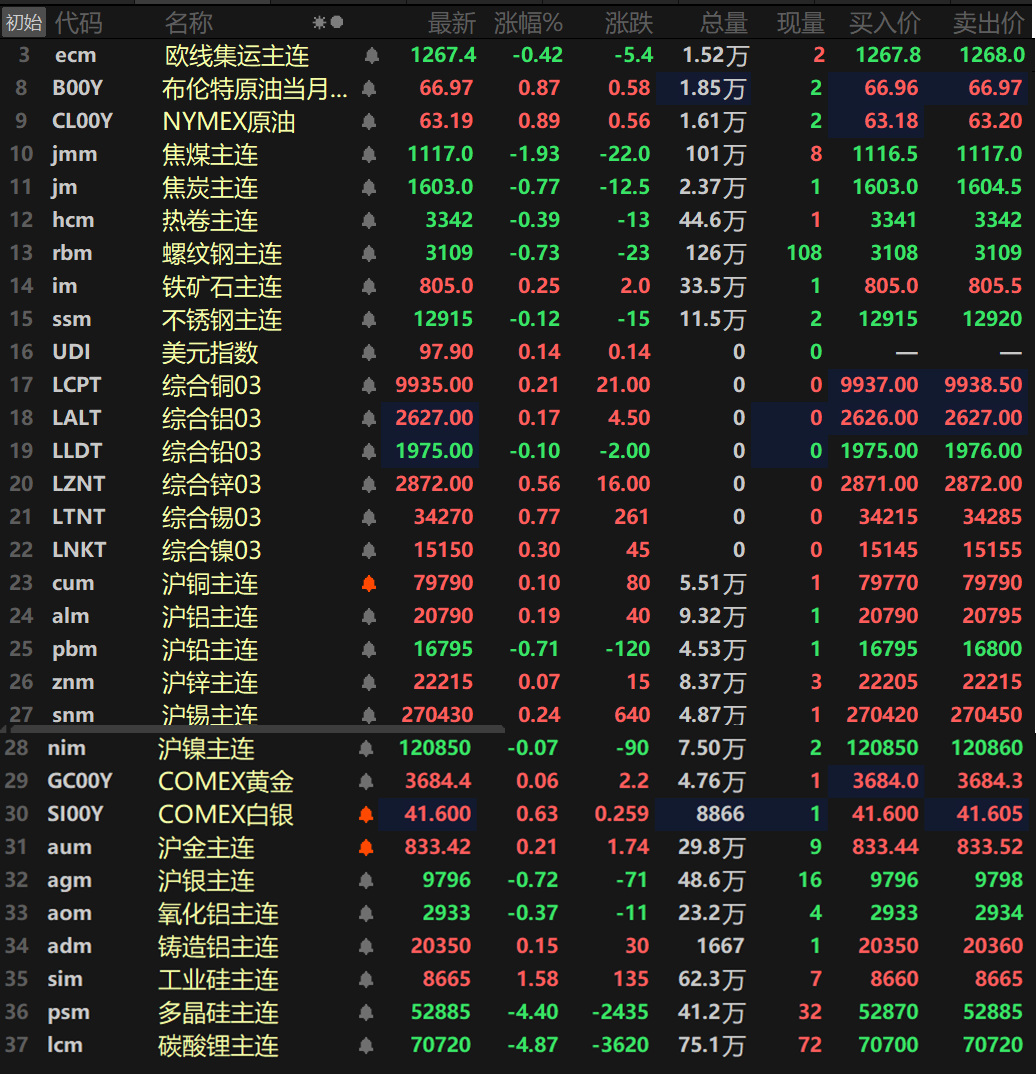 此外,碳酸锂主连跌4.87%,多晶硅主连跌4.4%,工业硅主连涨1.58%。欧线集运主连跌0.42%报1267.4。