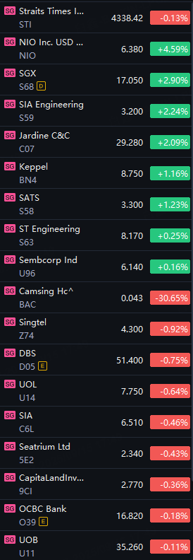 STI ranged between 4,331.75 and 4,348.64 throughout the day. It ended the session at 4,338.42, down 5.82 points or 0.13% compared to Friday's close.