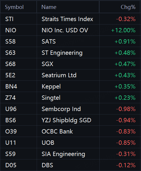 The Straits Times Index (STI), a key benchmark for the Singapore Exchange, ranged between 4,317.76 and 4,344.19 throughout the day. It ended the session at 4,323.78, down 13.96 points or 0.32% compared to Tuesday's close.