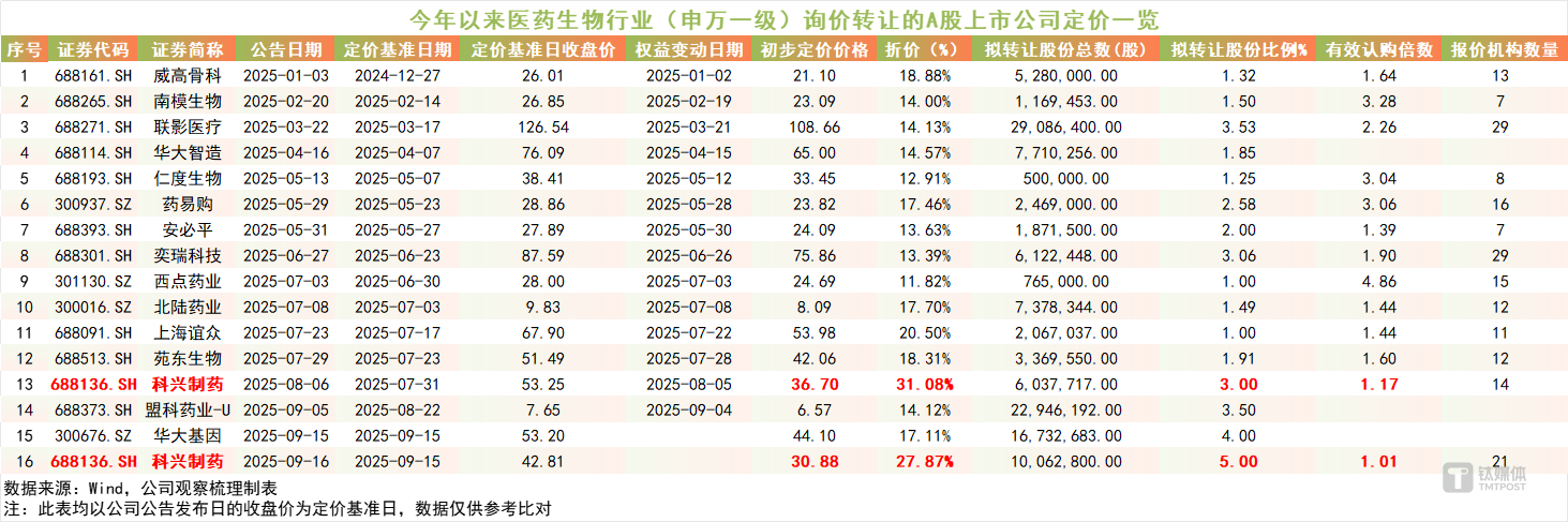 再看今年以来,A股医药生物行业(申万一级)已发生的16起询价转让案例。