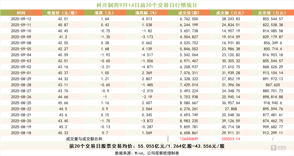 笔者以9月14日(周日)股东发布询价转让计划前的最后一个交易日为基准,向前追溯20个交易日计算,科兴制药的“20日均价”为43.556元/股,对应的转让价格下限为30.489元/股。而本轮转让最终定价为30.88元/股,几乎贴近拟定下限,相当于在定价基准上让利约29.1%。