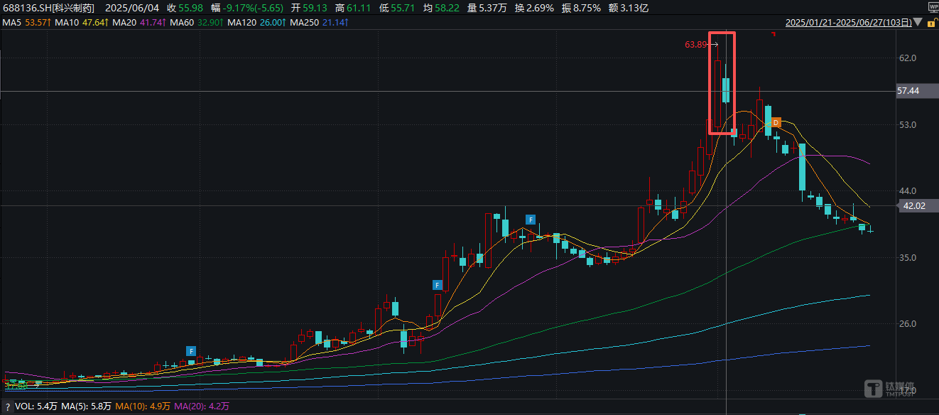 6月3日,科兴制药盘中股价一度触及63.99元(前复权),创下上市以来最高记录。截至6月4日减持公告发布当日,公司收盘报56.07元/股,较发行价累计涨幅已超150%。控股股东在这一时点进行大规模减持,当时已引发市场疑虑。公告次日,公司股价大幅下跌8.51%,创下近一个月内的最大单日跌幅。