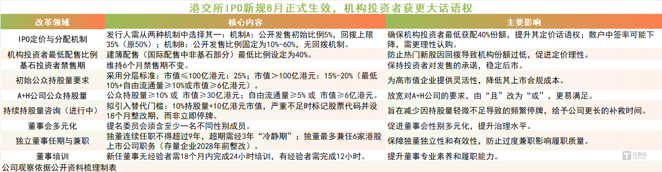 今年8月初,港交所正式实施的优化后的IPO市场新规,也特别强调了“提升机构投资者在IPO定价中的话语权”,确保定价合理性及后市稳定。新规主要涉及配售比例调整、回拨机制优化及公众持股要求修订,被视为港交所自上世纪90年代以来对IPO制度的最大调整。