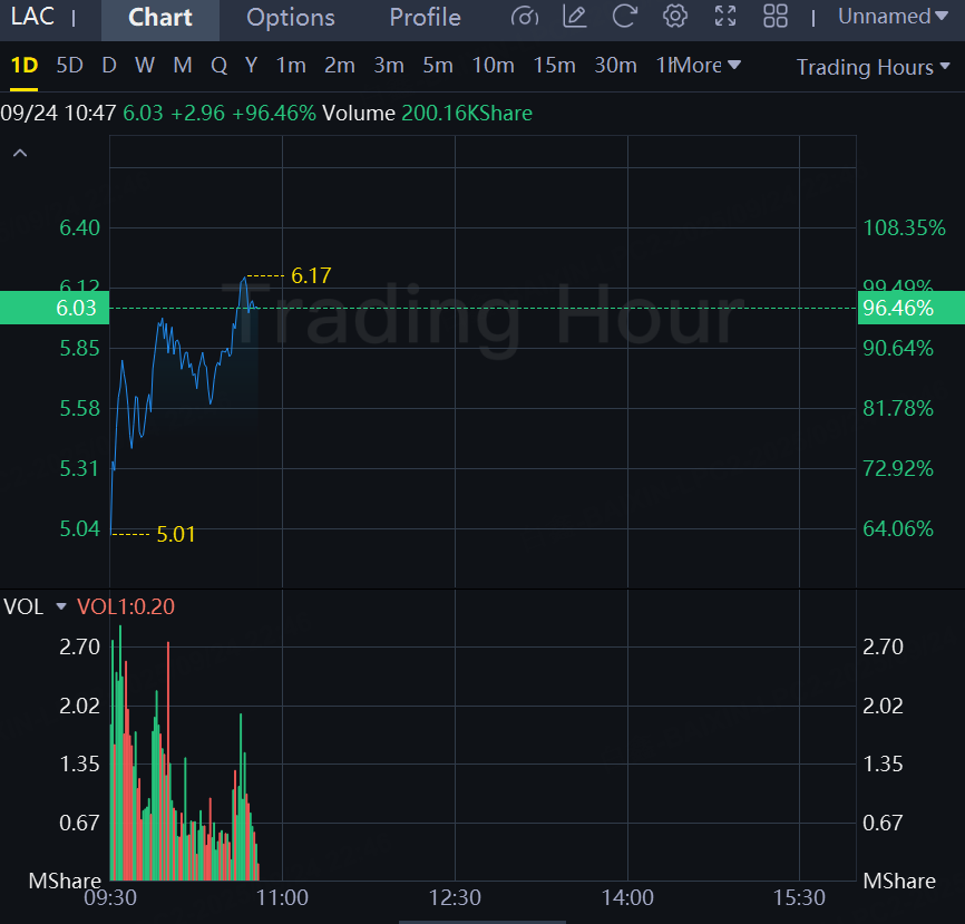 Shares of Lithium Americas soared 96% in morning trading following the news.
