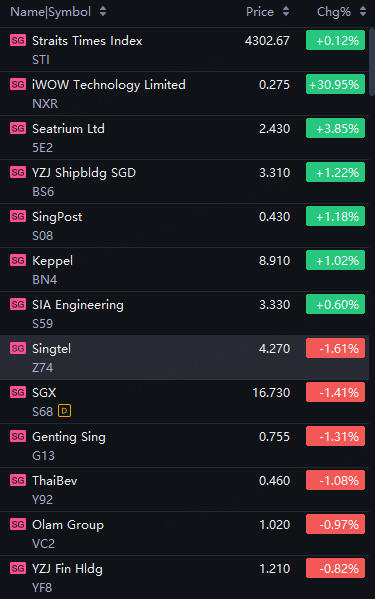 STI up 0.1%; iWOW Technology up 31%; Seatrium up 4%; Yangzijiang Shipbuilding rose 1%; Singtel fell 2%.