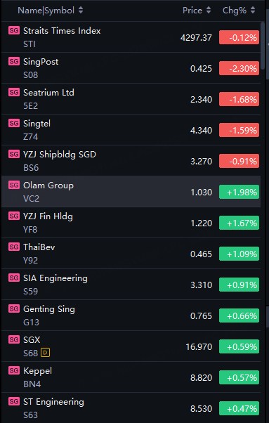 STI fell 0.1%; SingPost, Seatrium, and Singtel fell 2%; Yangzijiang Shipbuilding fell 1%; Olam rose 2%.