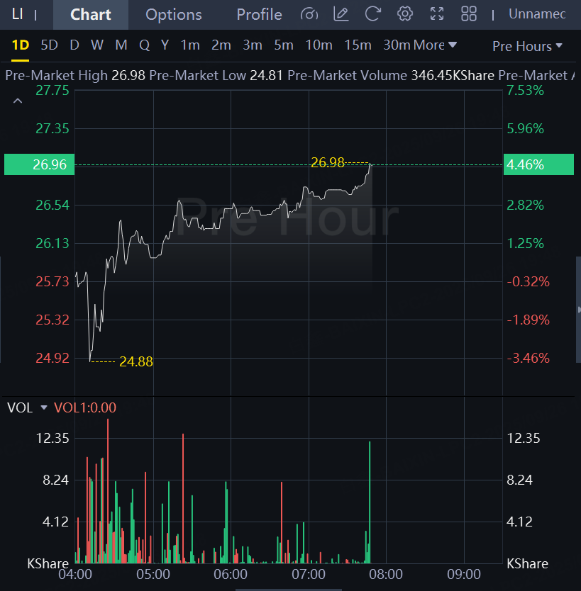 Li Auto shares were up 4.5% in recent premarket activity Friday after the company said it launched a five-seat battery electric sport utility vehicle.