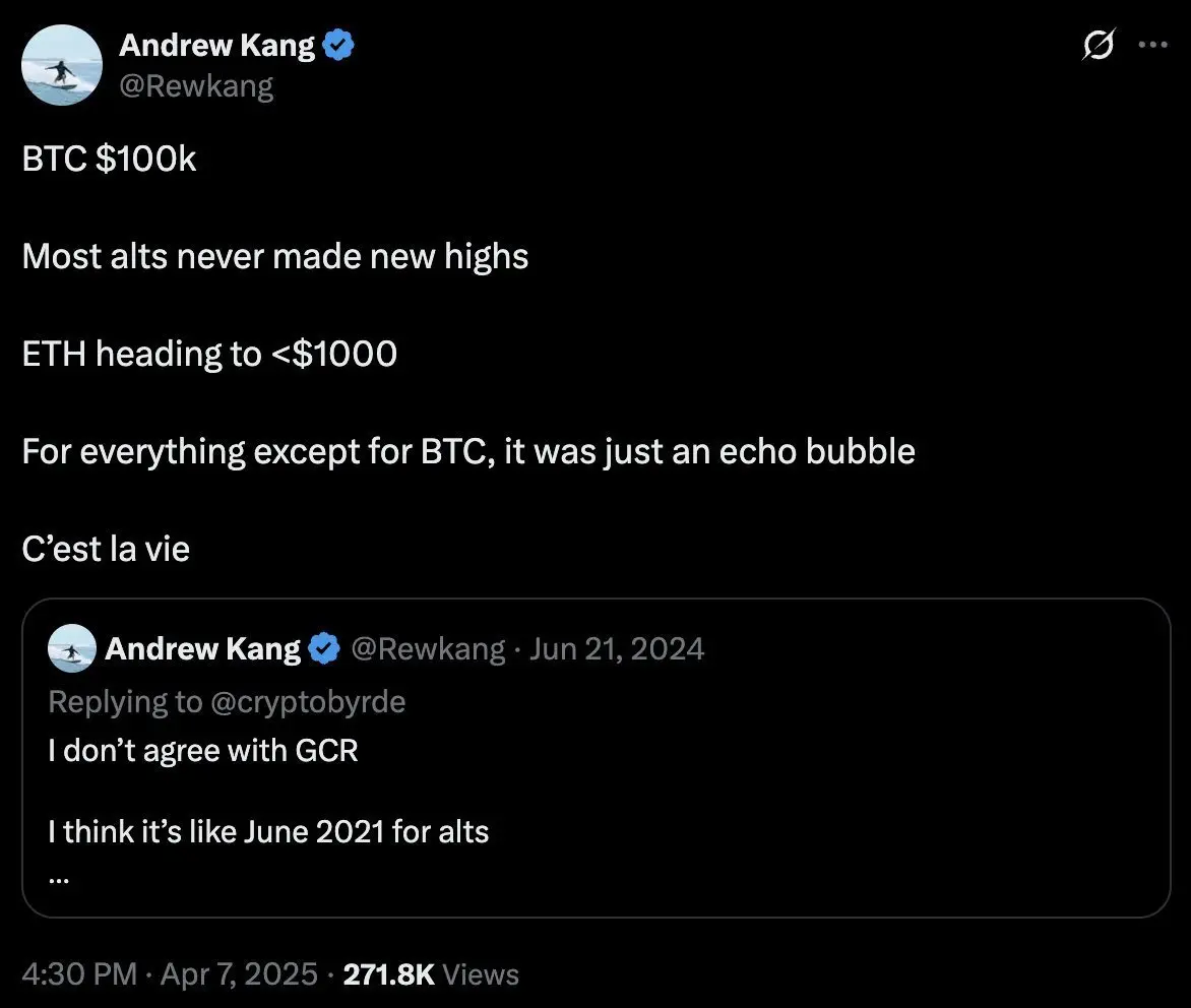 补充一点,Andrew Kang 在今年四月市场整体回调时曾预测 ETH 将跌破 1000 美元,后续在 ETH 上涨过程中也曾发表过看空观点……仓位决定脑袋,所以他的立场可能会与 Tom Lee 处于两个极端,建议大家辩证地去看待。