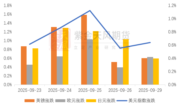 上周美元兑日元升值1.0%、美元兑欧元升值0.4%、美元兑英镑升值0.5%。
