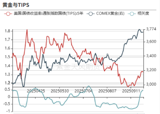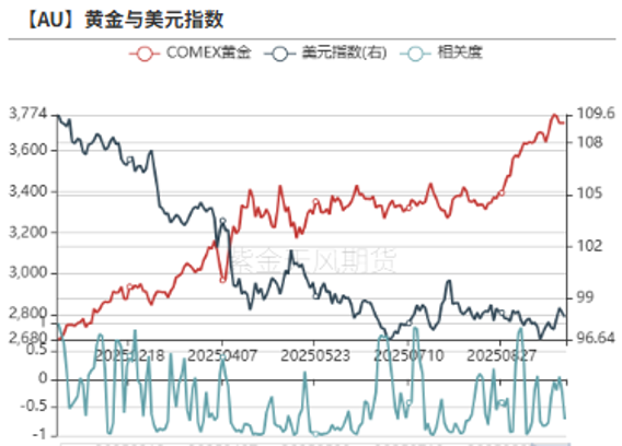 上周美元指数与黄金价格同向变动,黄金上周上涨2.01%,美元指数上涨0.55%至98.2,两者滚动相关性下降。