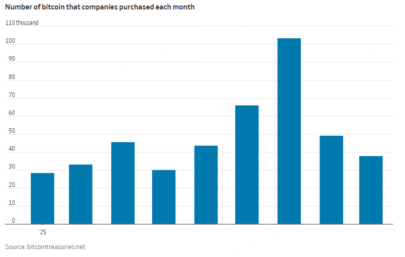 Corporate purchases of bitcoin have fallen steadily in recent months, and in September dropped to their lowest pace since April. A quarter of the public companies that adopted a bitcoin treasury strategy are now trading below the total value of their digital-token holdings, according to K33 Research.