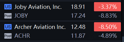 Joby stock dropped 3.4%, closing at $18.91. Archer shares fell 8.5%, closing at $12.48. The S&P 500 and Dow Jones Industrial Average lost 0.4% and 0.2%, respectively.