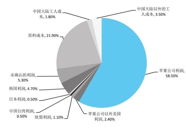 不过,在这个数字背后,还有一个冰冷冷的苹果利润分布图,也就是一台苹果手机中,各大部分占比到底是多少,这里包括了元件成本,人工成本,以及各大部分的利润占比情况。