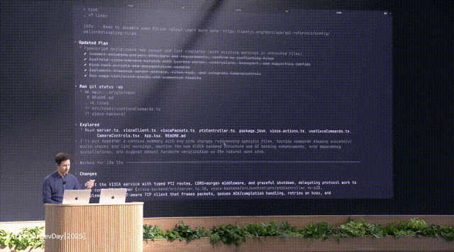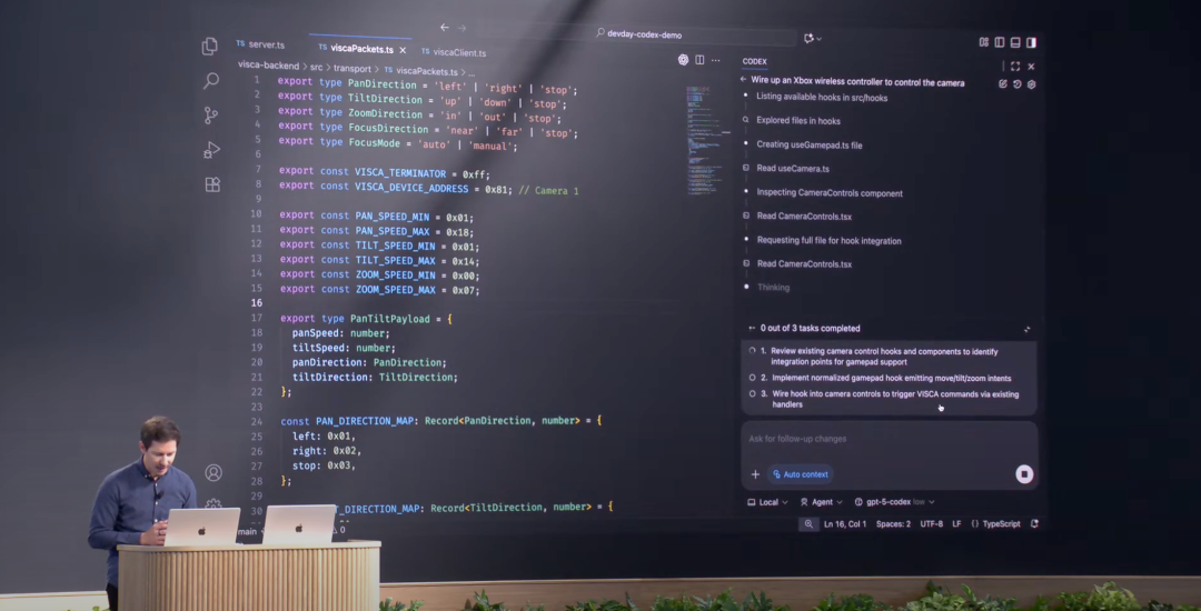 只需说一句,“将灯光聚焦到观众席”,Codex便通过MCP服务器控制会场灯光系统,瞬间点亮观众席。