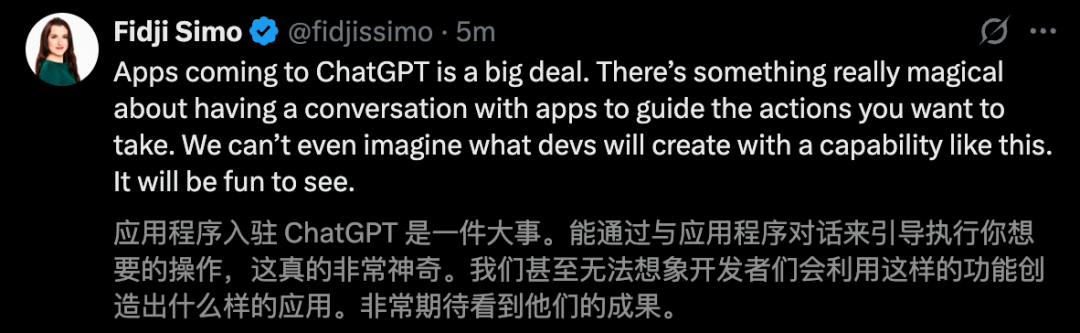 OpenAI的应用CEO Fidji Simo盛赞这个功能将“无法想象”,非常期待开发者打造的应用。