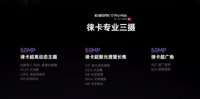 后置主摄上,三款机型均为50MP,但传感器有所不同,小米17是光影猎人950,小米17Pro和ProMax则是光影猎人950L,ProMax的主摄传感器尺寸更大(1/1.28英寸),进光量更足,在夜景等场景下表现更优。