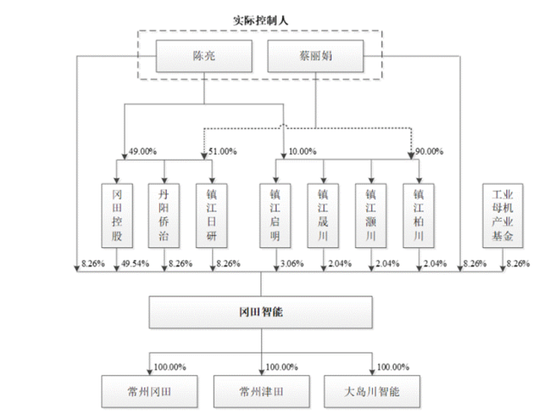 招股书显示,冈田智能主营业务为数控机床核心功能部件的研发、生产与销售,主要产品包括刀库、主轴、转台,产品主要应用于金属切削类数控机床。截止招股书签署日,冈田智能智能的实际控制人为陈亮、蔡丽娟夫妇,二人通过直接持股以及冈田控股、丹阳侨治、镇江日研等7家控股平台合计控制公司91.74%的股份。冈田智能旗下共有三家重要子公司,分别为大岛川智能、冈田精机、津田精密。