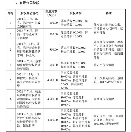 据招股书披露,2013年3月,陈亮、陈寿金(陈亮之父)出资设立冈田有限,注册资金为100万元。其中,陈亮持股 90.00%,陈寿金持股 10.00% ,但陈寿金 所持股权为代陈亮、蔡丽娟持有。2013年10月,陈寿金又将所持股权转让给杨金凤(蔡丽娟的母亲,陈亮的岳母)。与此同时,陈亮又将其所持有的90%股权转让给了蔡志明(蔡丽娟的父亲,陈亮的岳父)。至此,陈亮、蔡丽娟所持有的甘田有限的100%股权全部交由陈亮岳父、岳母二人所代持。
