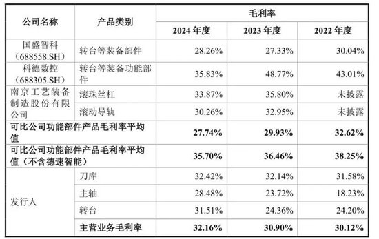 此外,对比行业可比上市公司来看,冈田智能毛利率仍旧偏低。据招股书披露,除了德速智能一家企业之外,昊志机电、速锋科技等可比上市公司毛利率水平均大幅高于冈田智能。尤其是主轴产品这一品类,可比上市公司该类产品的毛利率普遍在35%以上,速锋科技、思维福特主轴产品毛利率则接近或者超过40%,但冈田智能主轴产品毛利率尚不足30%。