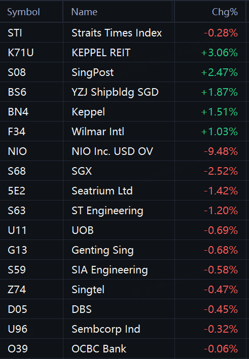 The Straits Times Index (STI), a key benchmark for the Singapore Exchange, ranged between 4,341.97 and 4,369.73 throughout the day. It ended the session at 4,356.20, down 12.22 points or 0.28% compared to Wednesday's close.
