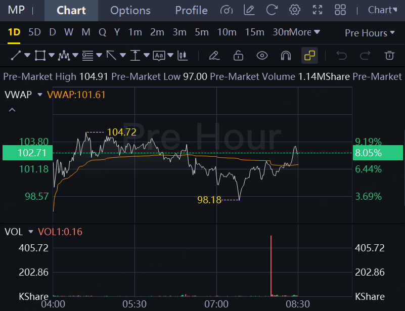 MP Materials shares rose 8% to $102.71 in premarket on Tuesday. It comes after a 21% gain on Monday and an 8.4% jump on Friday.