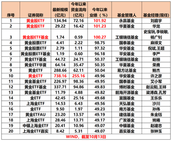业绩方面,截至10月13日,黄金主题ETF年内单位净值增长率均为正,平均值为64.55%。