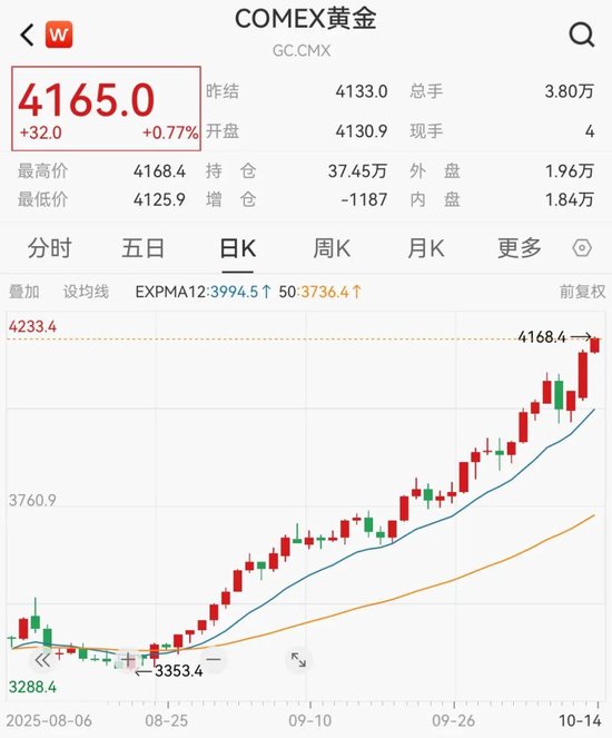 10月14日盘中,国际金价持续拉升,截至发稿,伦敦现货黄金价格站上4140美元/盎司,COMEX黄金期货价格站上4160美元/盎司,续刷历史新高。