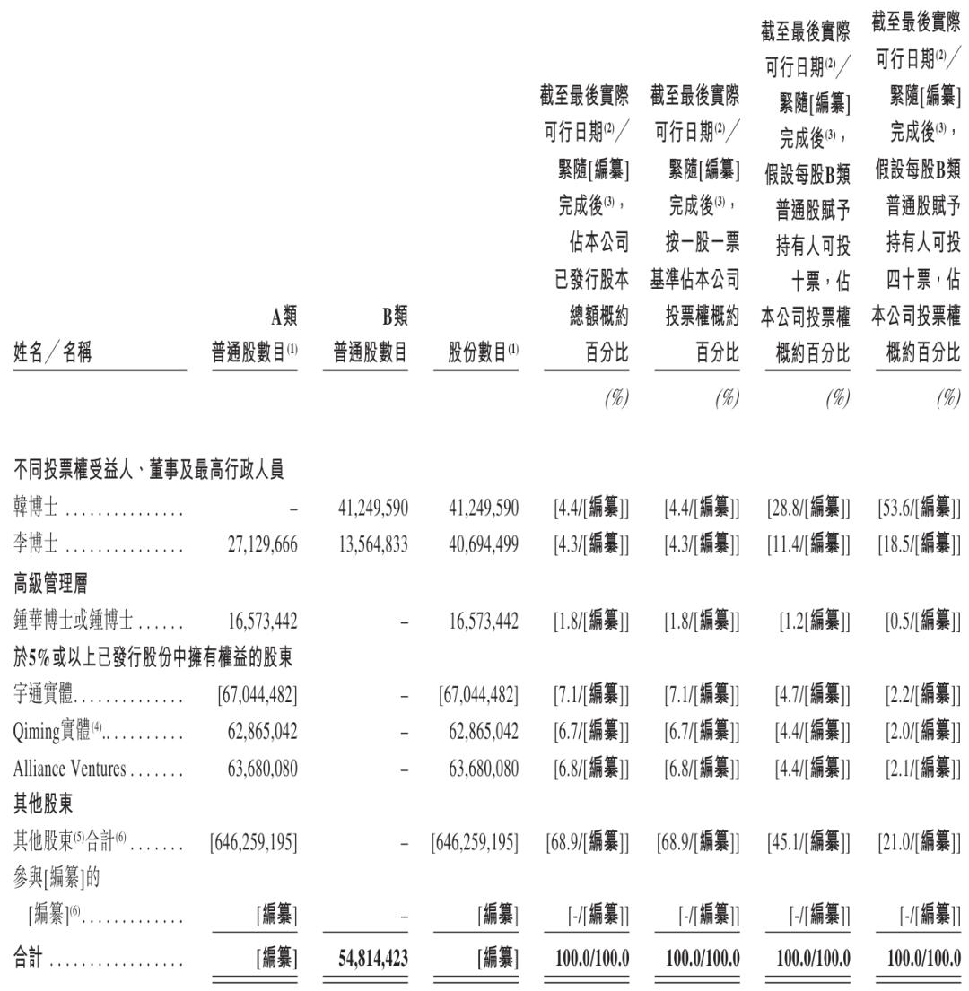 IPO前,韩旭博士通过XHL及THL持有41,249,590股B类普通股的权益,约占公司已发行股本总额的4.40%,及公司投票权的53.64%;李岩博士通过Humber Partners持有27,129,666股A类普通股和13,564,833股B类普通股的权益,约占公司已发行股本总额的4.3%,及公司投票权的18.5%(基于每股A类普通股赋予持有人可投一票及每股B类普通股赋予持有人可投40票计算);上述创始人和联合创始人合计持有公司投票权的72.1%,形成了稳固的管理层控制权。