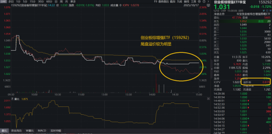 跟踪创业板综指数的创业板综增强ETF(159292)全天弱势表现,收跌1.72%,周线两连阴,场内成交1189万元。值得注意的是,尾盘溢价较为明显,溢价率达0.81%。前十大权重股中,阳光电源跌超10%,单日成交额达182亿元,居全市场首位,宁德时代、新易盛、胜宏科技等跌幅均超2%,中际旭创逆市收涨超1%。