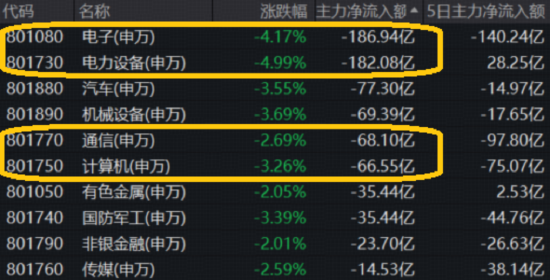 资金流向方面,电子、电力设备、通信、计算机等热门行业均迎来主力资金大幅流出,电子行业今日主力净流出186亿元,位居行业主力净流出榜首位,电子设备行业净流出182亿元,紧随其后。