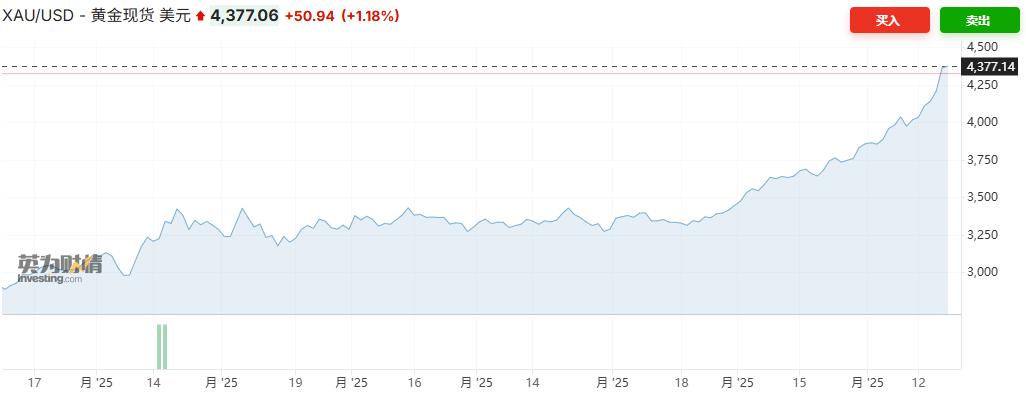 周五,现货黄金涨幅扩大,创下历史新高,一度逼近4380美元。截至发稿,涨幅为1.18%,报4377美元。黄金热潮促使贵金属在2025年不断创下价格纪录,延续了去年本已强劲的涨势,并超过了股票市场的回报。10月中旬,随着美国政府关门持续、中美紧张局势升级以及投资者押注美联储将进一步降息,金价突破了每金衡盎司4300美元。