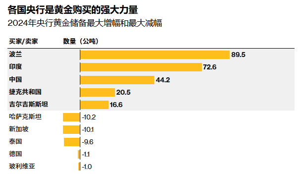 根据世界黄金协会的数据,2024年,各大央行连续第三年购买了超过1000吨的黄金,持有的黄金约占全球已开采黄金总量的五分之一。在储备方面最为积极的国家中,包括那些未加入二战后布雷顿森林体系的国家——该体系本质上是以黄金为基础的货币秩序。