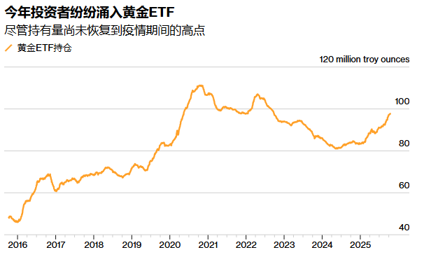 美元上涨、特朗普大幅降低关税或俄乌达成和平协议,都可能拖累金价下跌。随着投资者获利了结,市场最终也可能出现盘整。即便如此,黄金ETF的总持仓量仍远低于2020年的峰值。