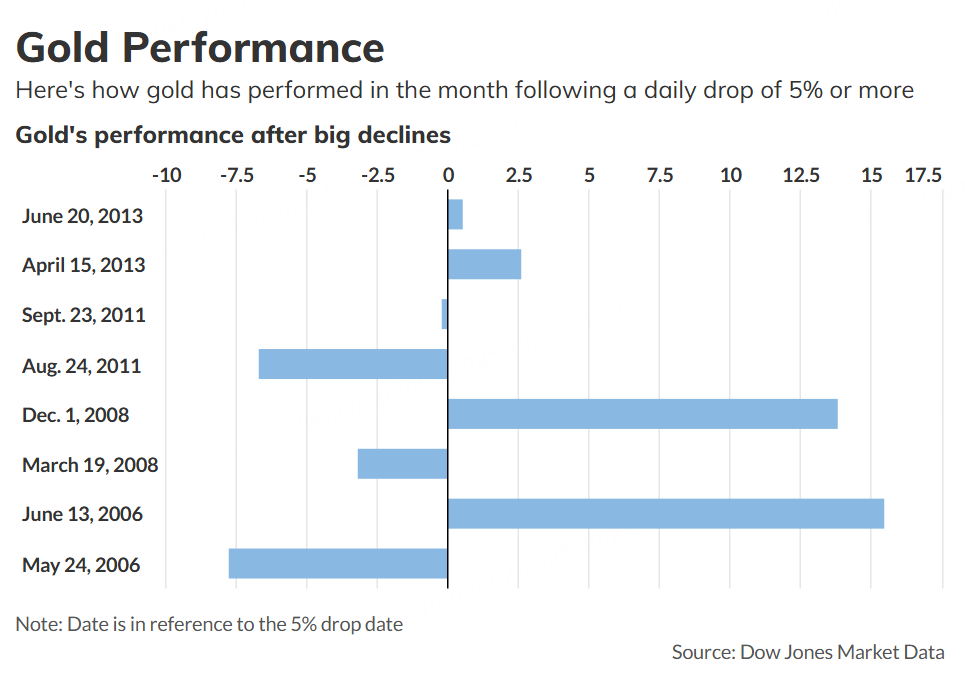 But a look at previous big daily declines for the precious metal — those of 5% of more — shows that drops like this one may not have a lasting effect.