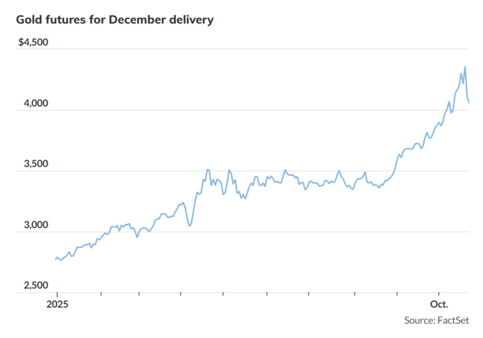 Gold for December delivery, the most active contract, had rallied 56% for the year through Tuesday’s session. It peaked at $4,398 per ounce in Monday intraday trading as investors searched for safe havens from economic uncertainty, inflation risks and simmering U.S.-China trade tensions.